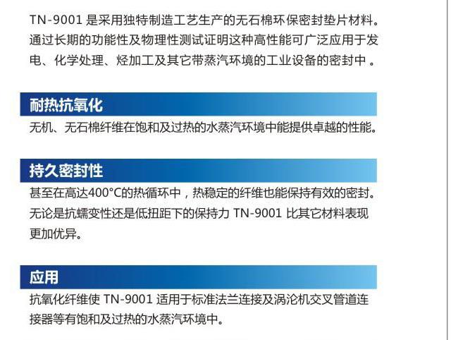 TN-9001是采用獨(dú)特制造工藝生產(chǎn)的無石棉環(huán)保密封墊片材料,通過長期的功能性與物理性測試證明這種高性能可廣泛應(yīng)用于發(fā)電、化學(xué)處理、烴加工及其它蒸汽環(huán)境的工業(yè)設(shè)備的密封中。