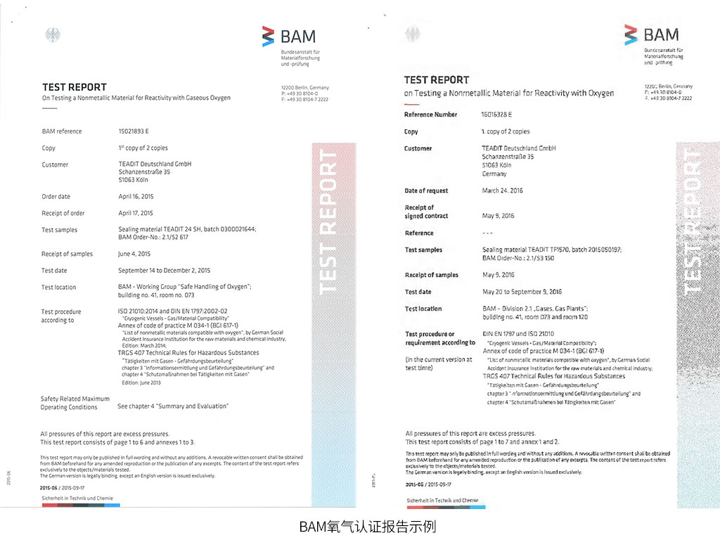 SealTex索拓合作品牌TEADIT泰迪如下型號(hào)具有BAM氧氣認(rèn)證測(cè)試報(bào)告: