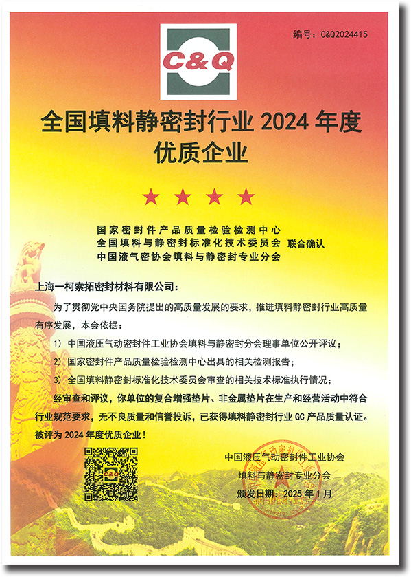 上海一柯索拓密封材料有限公司榮膺"全國填料靜密封行業(yè)2024年度優(yōu)質(zhì)企業(yè)"稱號,以創(chuàng)新密封技術(shù)驅(qū)動產(chǎn)業(yè)未來。